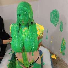 After footage shows Courtney playing in the pie and slime slop with her feet. After this, she uses her hair like a mop as she swishes it through the mess over and over again. After rubbing some slop into her hair, she finishes by sitting up and rubbing more into her chest.