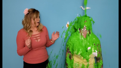"Two messy pros have to write a messy skit. How tough can it be?" You'd think, after given the task to write a messy skit, that Kelli and Tori would set it up so that they would never get dirty. Whoops! The lovely ladies get obliterated with different shades of green, and the cameo from The Wife adds to the duo's mess. Kelli and Tori should work together more often. | |
